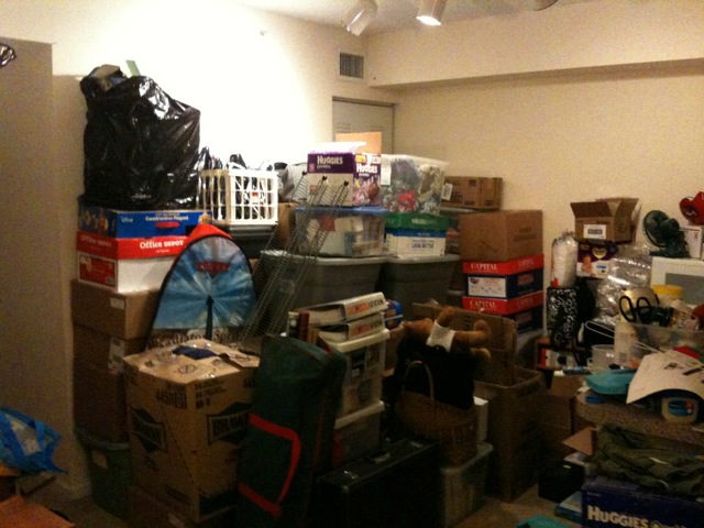 The last couple of days before moving I packed up everything except what we would need for a couple of days. It was like staying in a hotel. I had as much as I could in our dining room after moving our table out of the way and stacked it all up in one spot so it was easy to get at.